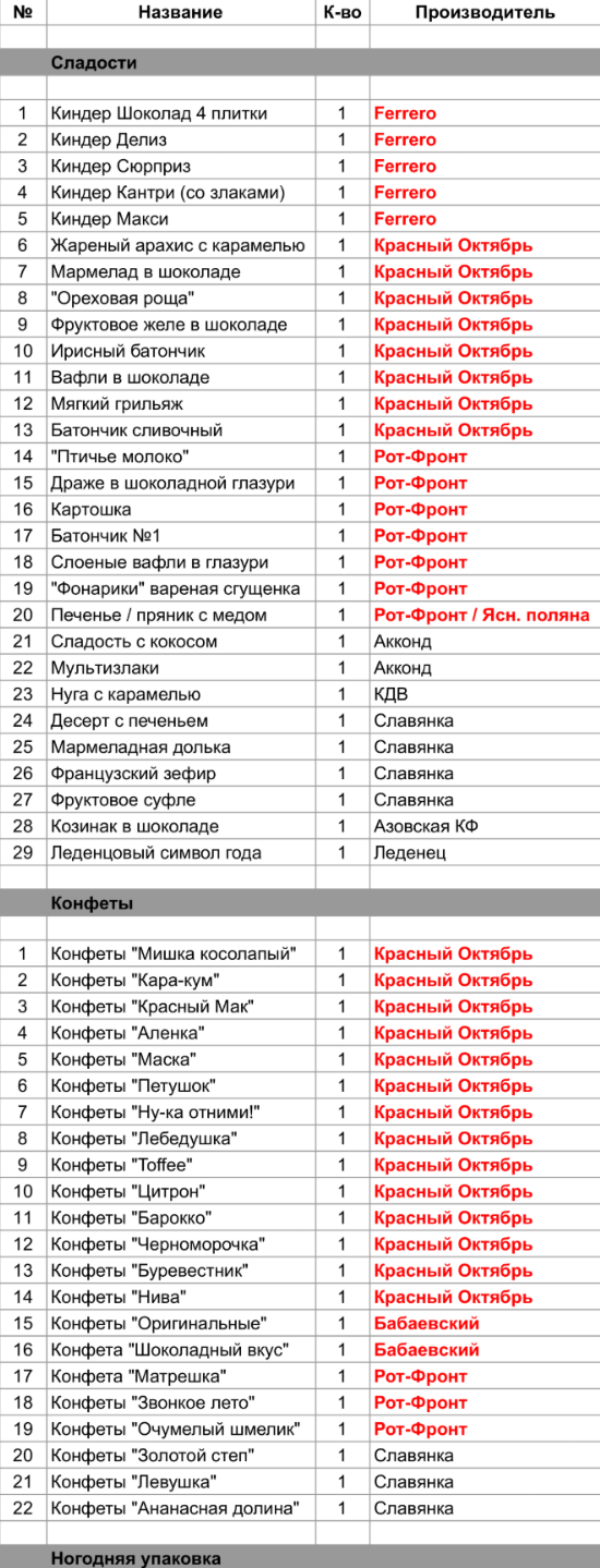 "Птичье молоко" (1 шт), Драже в шоколадной глазури (1 шт), Картошка (1 шт), Батончик №1 (1 шт), Слоеные вафли в глазури (1 шт), "Фонарики" вареная сгущенка (1 шт), Печенье / пряник с медом (1 шт), Конфета "Матрешка" (1 шт), Конфеты "Звонкое лето" (1 шт), Конфеты "Очумелый шмелик" (1 шт)